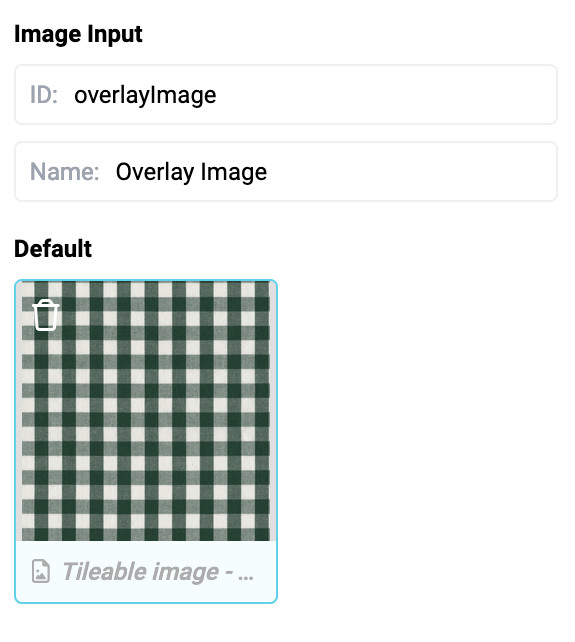 While the base material is fixed, the overlay image as well as the width and height are transferred to the configurator via the corresponding input node (image input and number input).